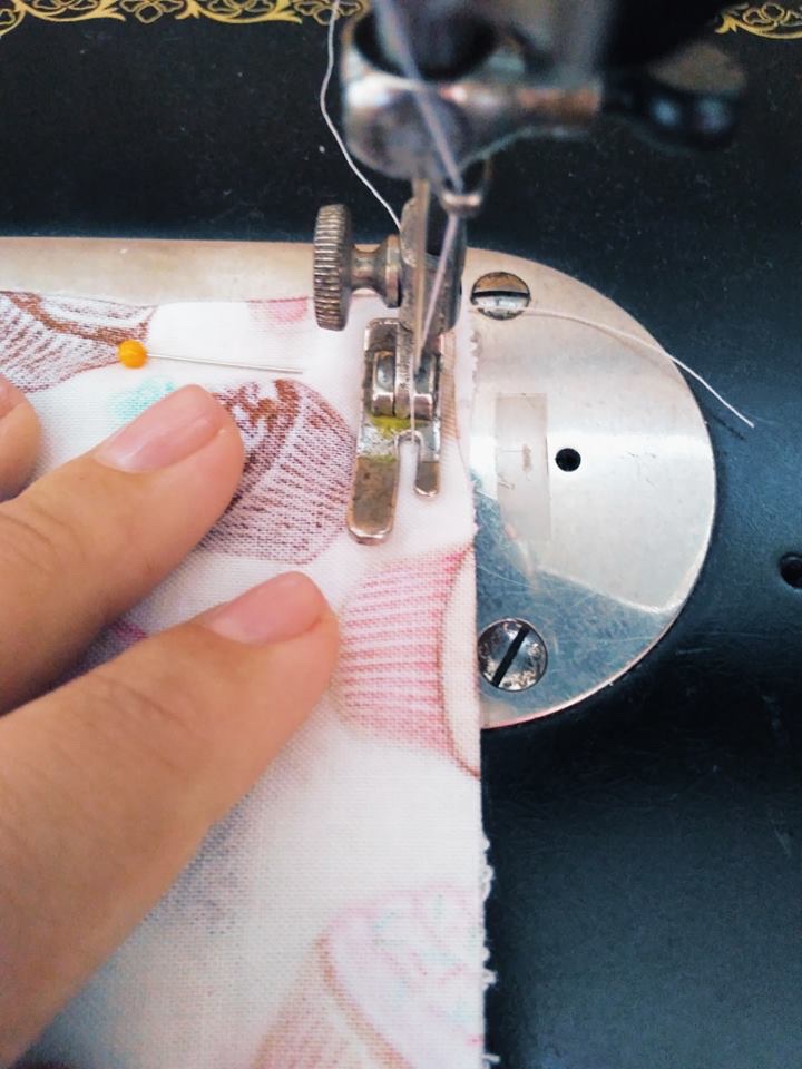 Une fois vos carrés préparés, à la machine, faites une piqûre droite sur l’ensemble des trois côtés et sur le dernier restant, jusqu’à la moitié seulement pour pouvoir le retourner.