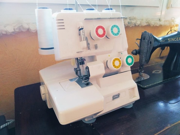 Et voilà enfin l’arrivée de la surjeteuse ! (Je vous avoue que c’est ma technique préférée parce que c’est plus rapide.) Elle va faire une bordure finie, évitera à l’éponge de pelucher et gardera le coton démaquillant bien à plat. Il est tout à fait possible de faire quelque chose de similaire à la machine à coudre avec un point zigzag ou un point de feston à la main.