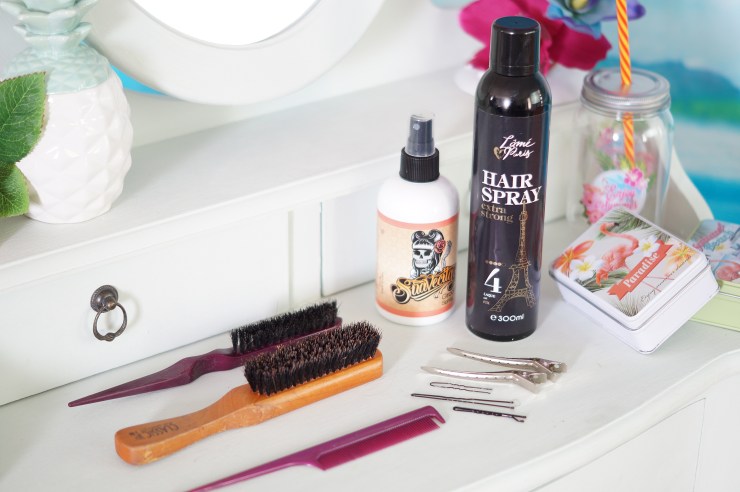 Un peigne à queue, une brosse à crêper, une brosse à cheveux, de la laque, des pinces (bobby pins pince à cheveux pinces pour maintenir les sections) et en option le grooming de Suavecita.
