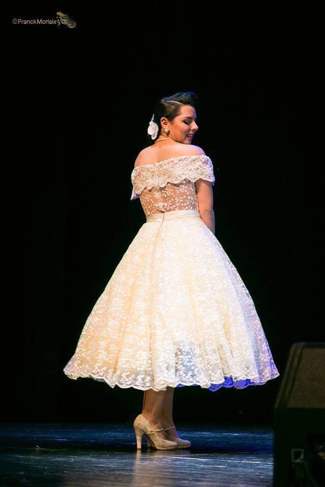 Puis Jessi Glambird, Miss pin up Bretagne, l’a à son tour contacté sur les recommandations de Cécile Gourdel (Miss Ronde Bretagne 2016/2017). « Nous sommes parties sur une robe de bal qui entrait parfaitement dans ma gamme de robe de mariée atypique, une jolie princesse vintage. Elle avait une furieuse envie de jaune ». Base en belle dentelle crème fine sur un jupon jaune pâle, un peu de dentelle perlée pour les épaules agrémentée d’un camaïeu de strass jaunes posées à la main, des boutons fantaisies et un joli nœud en satin, voilà la recette de la robe de la première dauphine Miss pin up France 2019 !