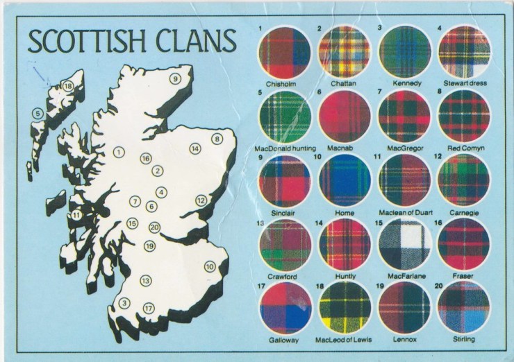 Le Tartan est un tissu à carreaux dont le motif est composé de lignes horizontales et verticales entrecroisées et qui est souvent de multiples couleurs. Chacun Tartan a une signification et est lié à un clan.