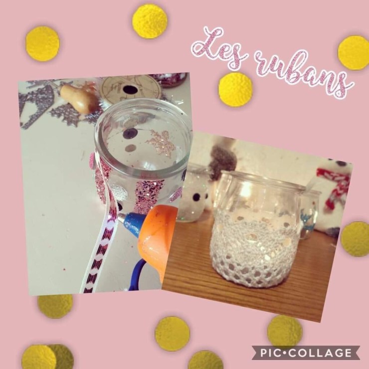 Une fois sec, vous pouvez y coller des strass, des rubans (ou tout ce qui passe par la tête de vos chérubins). Si les strass adhèrent mal sur les paillettes, je vous conseille d’utiliser le pistolet à colle mais attention aux doigts : ça brule!