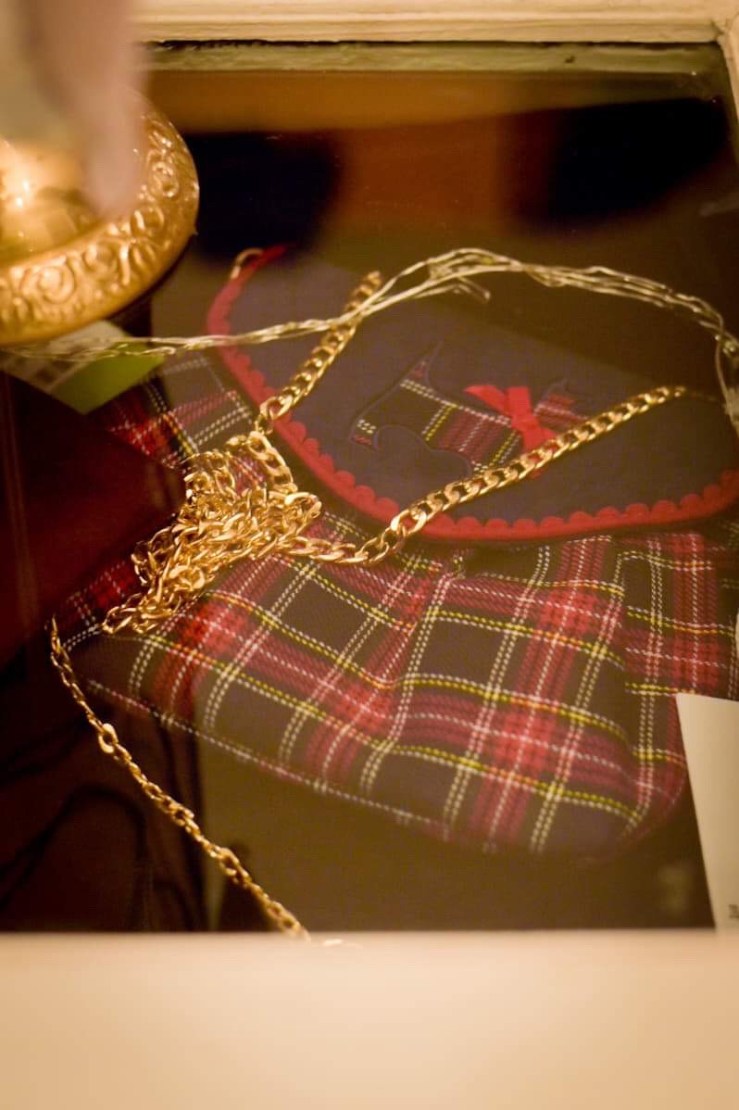 Ensuite, on monte. Les collants ou les bas, les chaussettes ou les mi-chaussettes. La ceinture, sur un manteau, une robe ou une jupe. Des écharpes et gants, les broches, car je suis une grande fan de broches, je pense que c’est élégant d’accessoiriser une écharpe, une robe, un col de chemise avec une jolie broche. Les sempiternelles boucles d’oreilles et les sacs à mains !