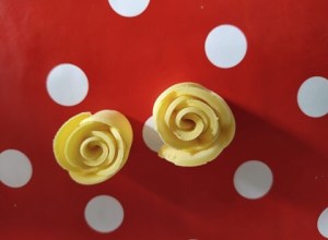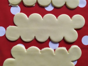 4. Avec l’autre pâte à sucre de couleur, procédez de la même façon que pour les feuilles. Puis une fois applatie et à l’aide de l’emporte-pièce spécial fleur, formez 6 « nuages » (à plat, ça ressemble à des nuages non !?)