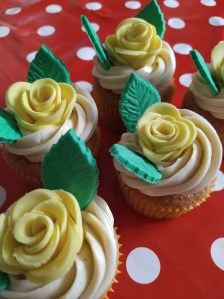 4. Placez la fleur en pâte à sucre au centre de chaque cupcake puis les feuilles de chaque côté. Si les éléments ne tiennent pas bien et/ou glissent à cause de la crème, plantez un cure-dent dans chaque feuille pour les piquer dans les gâteaux.
