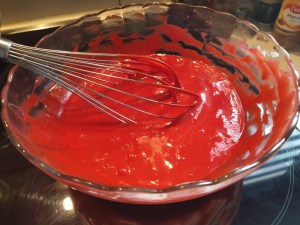 Incorporez la farine et le colorant alimentaire rouge (mieux vaut y aller doucement à la pointe du couteau et ajoutez si besoin au fur et à mesure jusqu’à obtenir la couleur souhaitée). Mélangez jusqu’à obtention d’une pâte lisse et homogène.