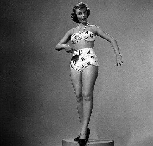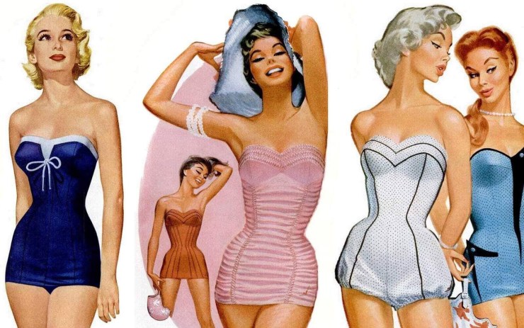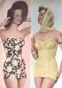 Les maillots de bain avaient une sensation tissé et un poids considérable par rapport aux tissus minces d’aujourd’hui. Un effort a été fait pour confectionner des tissus plus lisses qui épousaient les courbes d’une femme sans pli ni aspérités. Les hauts de soutien-gorge étaient généralement doublés et beaucoup avaient également des bonnets de soutien-gorge Pellon qui donnait l’effet d’une poitrine cônique aussi appelé « Bullet Bra » (le push up de l’époque). Des culottes de natation en caoutchouc pouvaient être portées sous les maillots de bain pour offrir encore plus de gainage. Inutile de dire que le maillot de bain était moins une question de natation que de ressembler à une pin-up. Ok c’est encore un peu le cas !