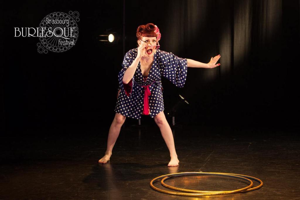 Oui, merci, c’était expérience incroyable. Déjà, j’ai eu la joie d’être sélectionnée car participer à un festival de cette ampleur et de cette qualité avec des artistes internationaux reconnus était déjà pour moi un pas en avant et une grosse motivation. Et là, bim ! en plus je gagne ! Que dire sinon la joie que ton travail soit reconnu par des artistes pro dont tu admires le travail, comme La Big Bertha ou Kiki Béguin. C’est Mademoiselle Champagne et Pearly Poppet qui organisent ce festival et je vous invite à vous y rendre l’an prochain si vous voulez en prendre plein les mirettes. En plus, j’y jouerai ! Pour ce concours j’ai retravaillé un de mes numéros qui s’appelle «coup de foudre à la plage», c’est une pin-up qui fait tout pour se faire remarquer par un beau surfeur… et elle galère ! Il y a du Hula-hoop dedans bien-sûr et j’ai poussé mon personnage dans un côté clownesque et absurde plus affirmé, j’ai aussi revu mon costume. J’ai bossé le truc, on peut le dire!