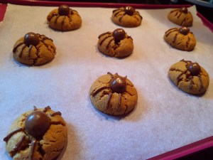 4. Déposez les boules chocolatées au milieu de chaque cookie encore tiède en appuyant légèrement.