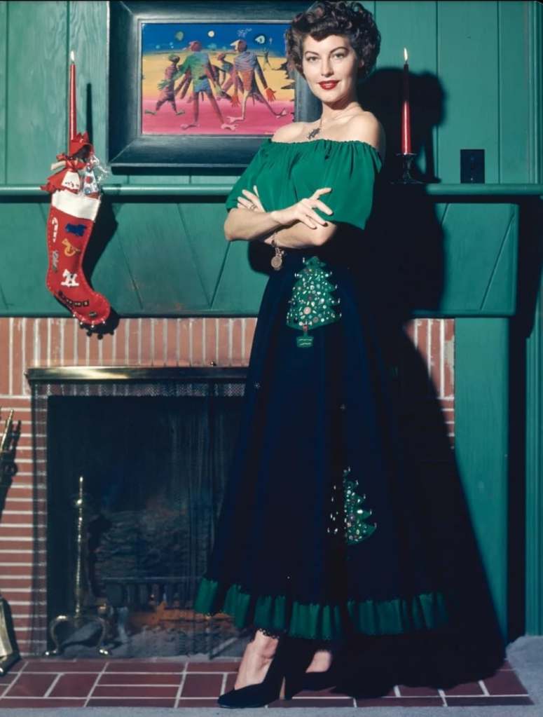C’est le cas de Audrey Hepburn, où l’actrice enlace tendrement son Père Noël. Ou de Marilyn Monroe, Shirley Temple, Jayne Mansfield, Kim Novak, Ava Gardner qui n’hésitent pas à prendre la pose, devant la cheminée, sous une couronne de houx, en décorant leur sapin, ou comme Hedy Lamarr en famille préparant les fêtes de fin d’année.