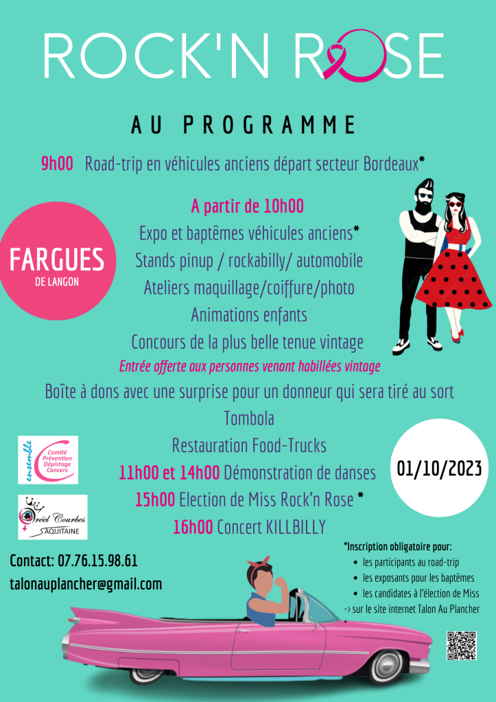 À l’occasion d’ Octobre Rose, Talon au plancher vous donne rendez-vous le 1er octobre 2023 au festival Rock’n Rose (Fargues de Langon (33210)).
