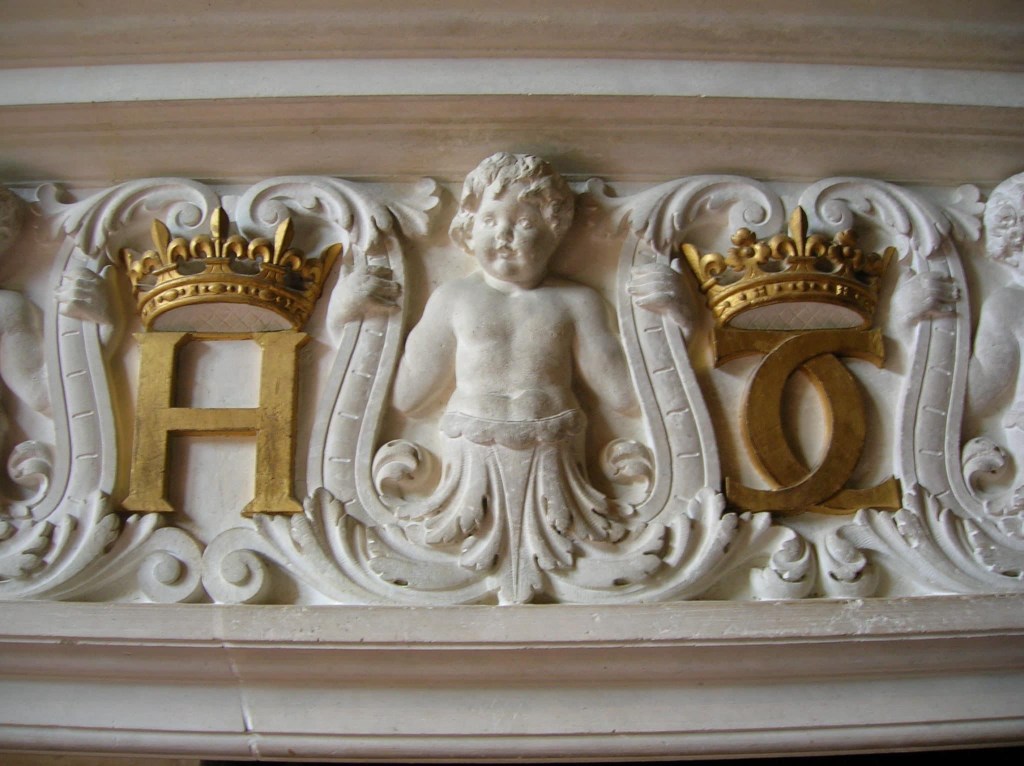 Aux côtés de l’emblème d’Henri II, ce sont ces mêmes double C de Catherine de Médicis que l’on retrouve sur une cheminée au château de Chenonceau.