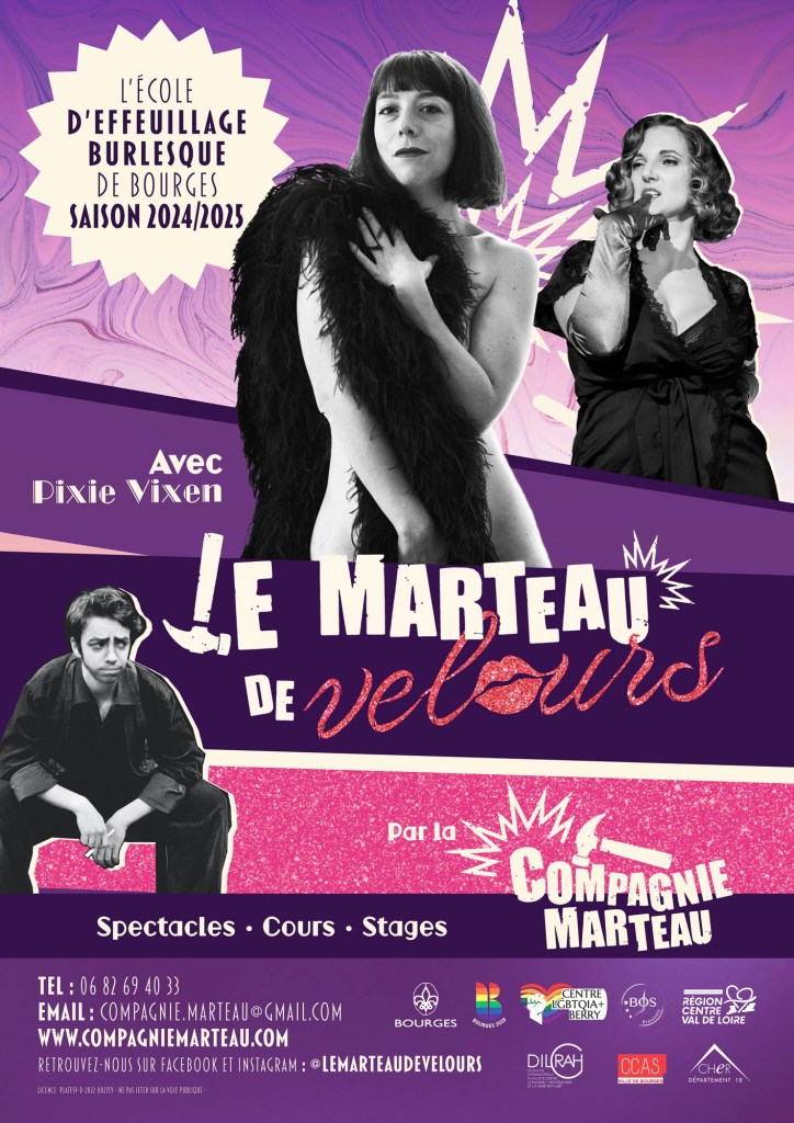 La nouveauté depuis la rentrée 2024, c’est l’arrivée de l’effeuilleuse Burlesque et Pin-up moderne Loretta Banana à l’école du Marteau de Velours. Formée par Vivi Valentine, effeuilleuse burlesque australienne installée à Paris, Loretta a enseigné la danse burlesque avec éventails en plumes à l’école des Plumettes à Paris. Fraichement arrivée sur Bourges, elle va proposer 10 stages de Burlesque Classique pendant toute l’année, à commencer avec un stage de maquillage Showgirl samedi 28 septembre prochain.