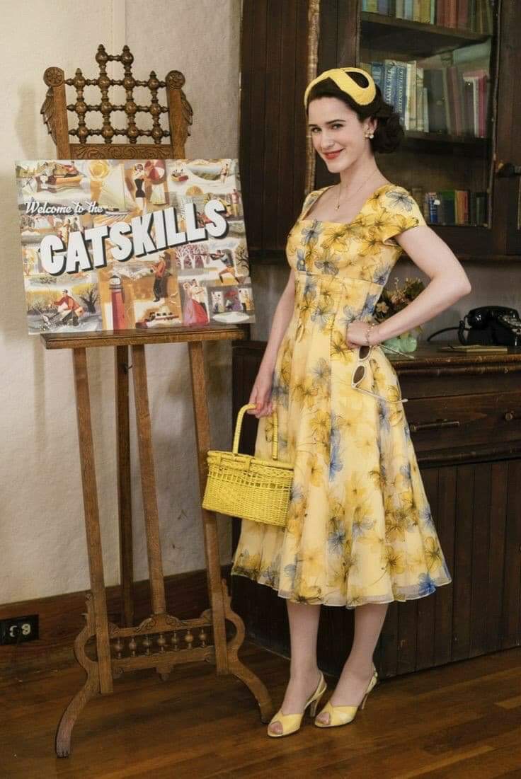 S’appliquant à créer des tenues en adéquations avec les humeurs du personnage de Myriam Maisel, elle nous sert sur un plateau un défilé de look acidulé.