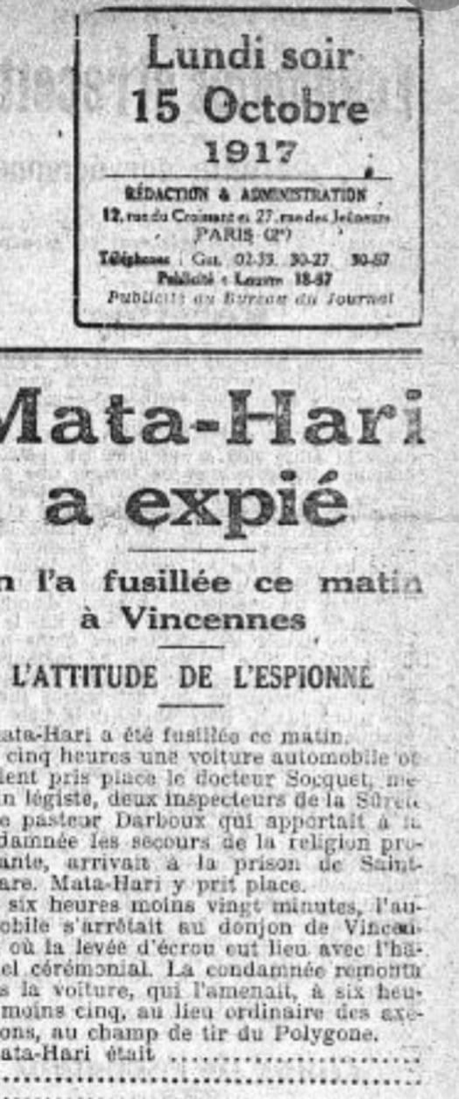 Démasquée puis utilisée pour transmettre de fausses informations par l’attaché allemand qu’elle tentait de séduire, nous ne connaîtrons jamais le fin mot de l’histoire qui conduira le contre-espionnage français à une perquisition dans sa chambre d’hôtel des Champs Élysées.