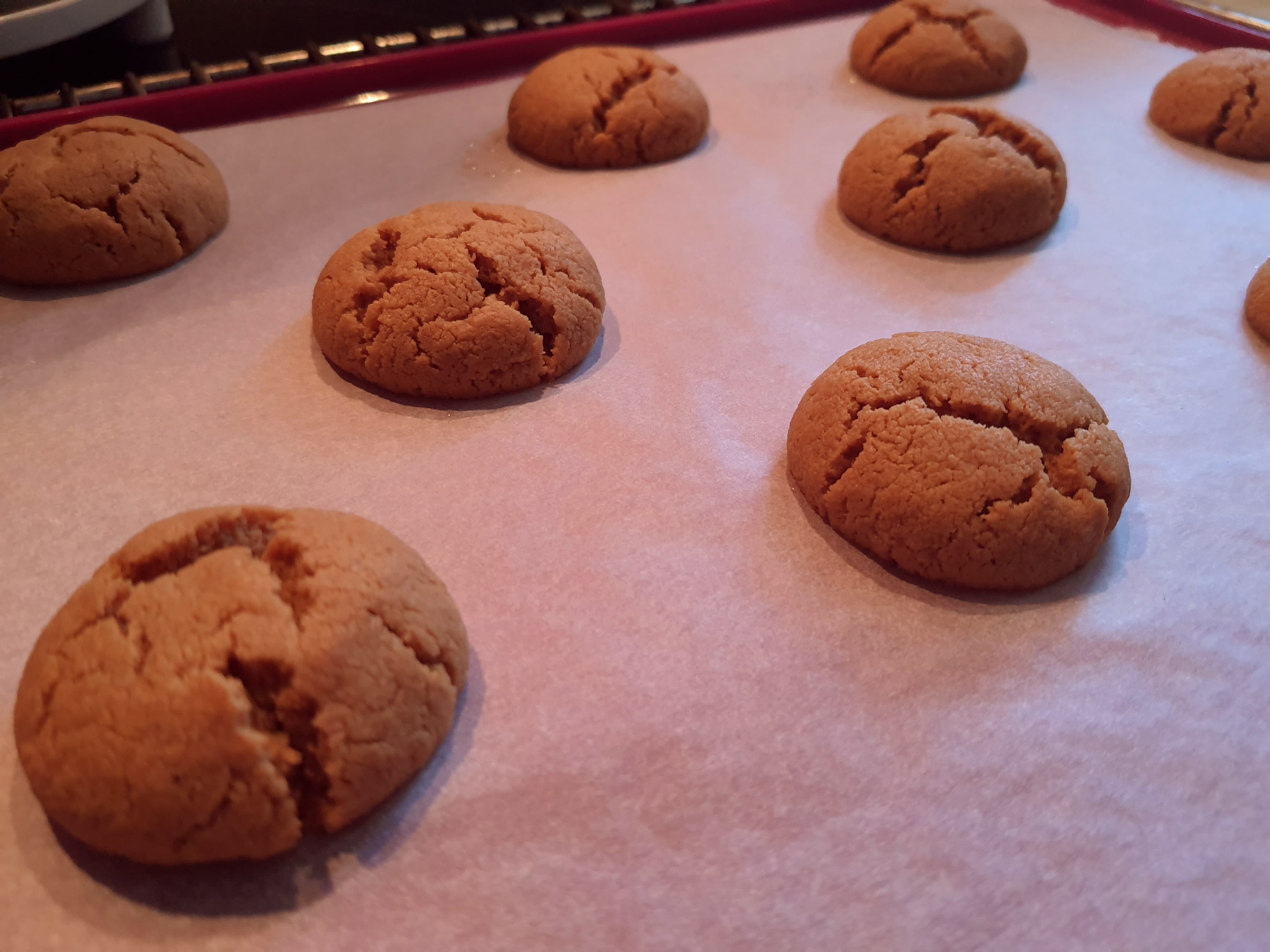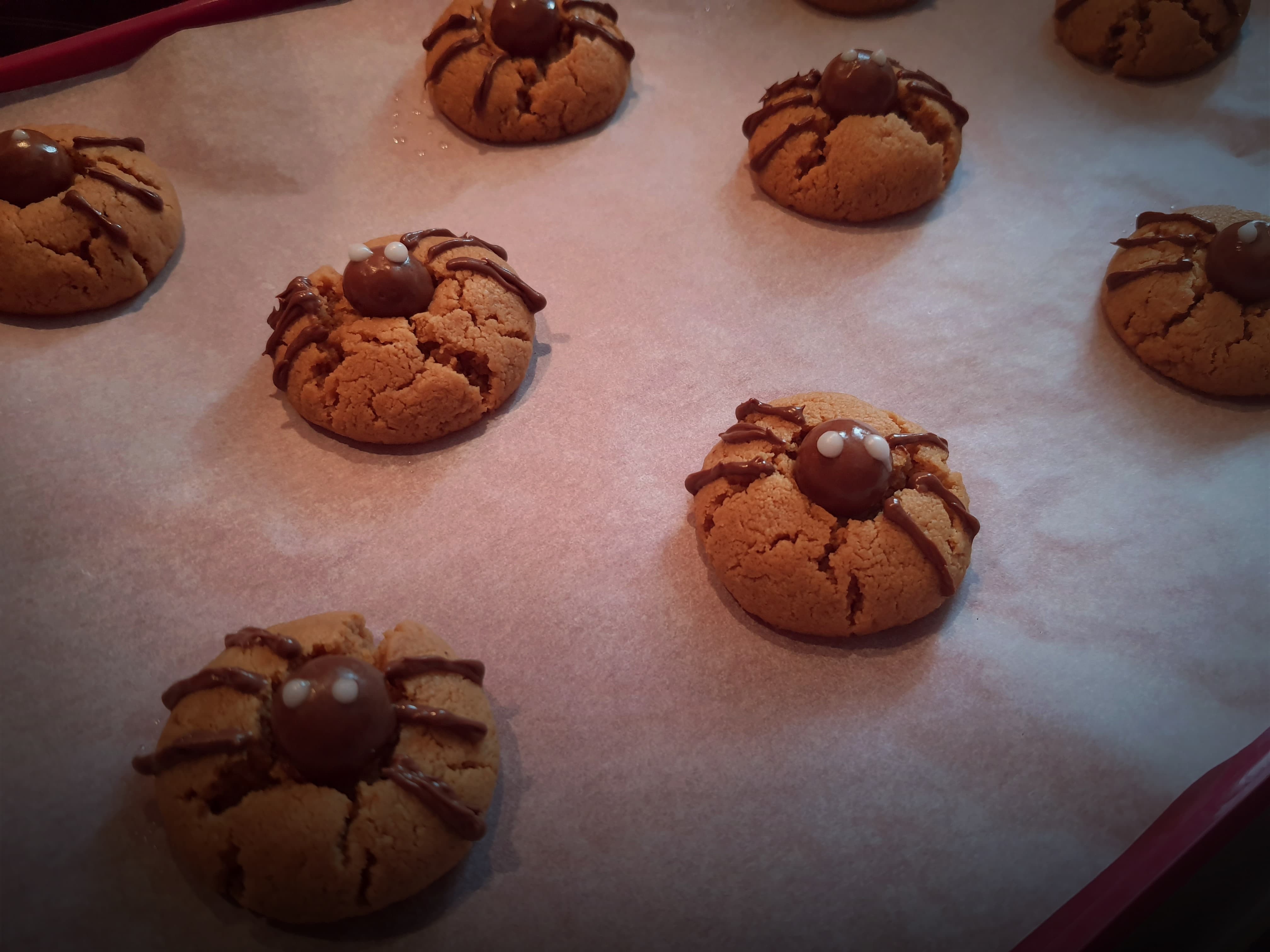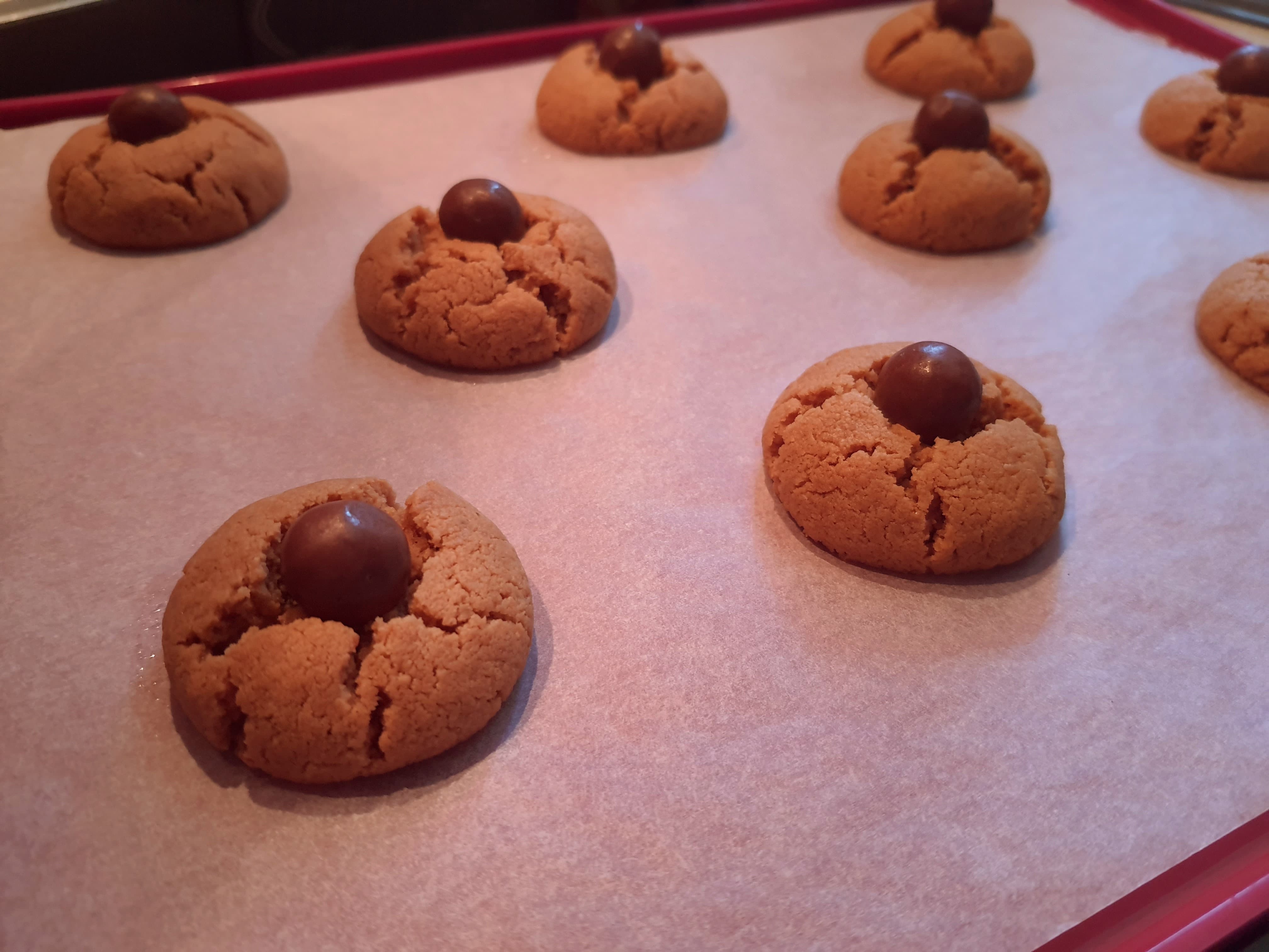4. Déposez les boules chocolatées au milieu de chaque cookie encore tiède en appuyant légèrement.
