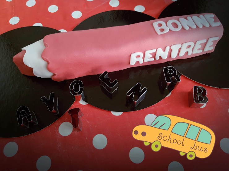 5. Après avoir étalé un peu de pâte à sucre blanche, il ne vous reste plus qu’à découper les lettres qui formeront le message « Bonne rentrée » puis placez-les sur le crayon. Je vous conseille d’humidifier légèrement le dos de chaque lettre pour qu’elles collent au gâteau.