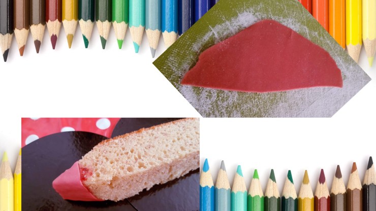 2. Formez avec une petite boule de la pâte à sucre de couleur (rouge pour moi) et la poser au centre du plan de travail. Aplatissez la pâte à l’aide du rouleau pâtissier jusqu’à obtenir 1 cm d’épaisseur. Formez un triangle arrondi et assez large et déposez-le délicatement sur la pointe du crayon. N’hésitez à mettre un peu de la confiture de votre choix sur le gâteau, cela aidera à faire « coller » la pâte à sucre.