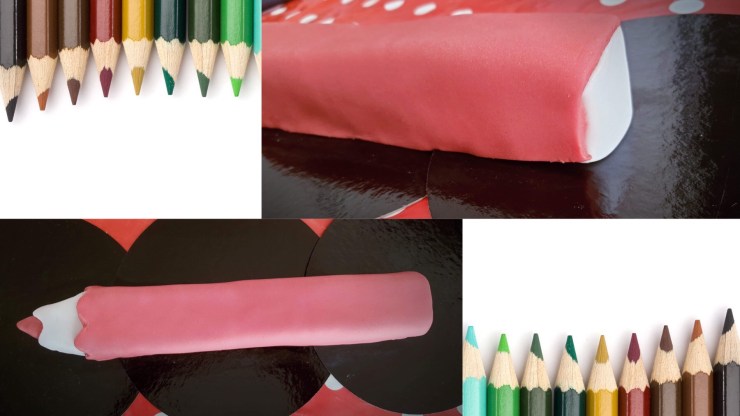 4. Etalez la pâte à sucre colorée sur une surface assez large qui pourra recouvrir tout le corps du crayon. Réservez également un triangle de pâte à sucre blanche que vous placerez au bout du crayon avant de couvrir avec la pâte à sucre de couleur.